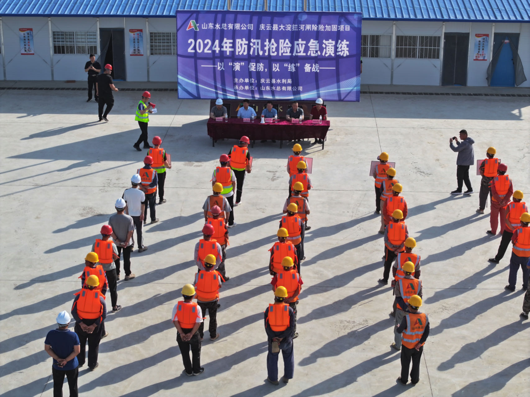 为有效应对极端天气造成的各类突发事件,健全完善反应迅速、处置有力的防汛抢险应急工作机制,切实提高洪涝灾害防范和应急处置能力,近日,基础有限公司庆云县大淀拦河闸除险加固项目开展了2024年防汛抢险应急演练。庆云县水利局党组成员、水库运行维护中心主任杨书军等全程观看了本次演练。
