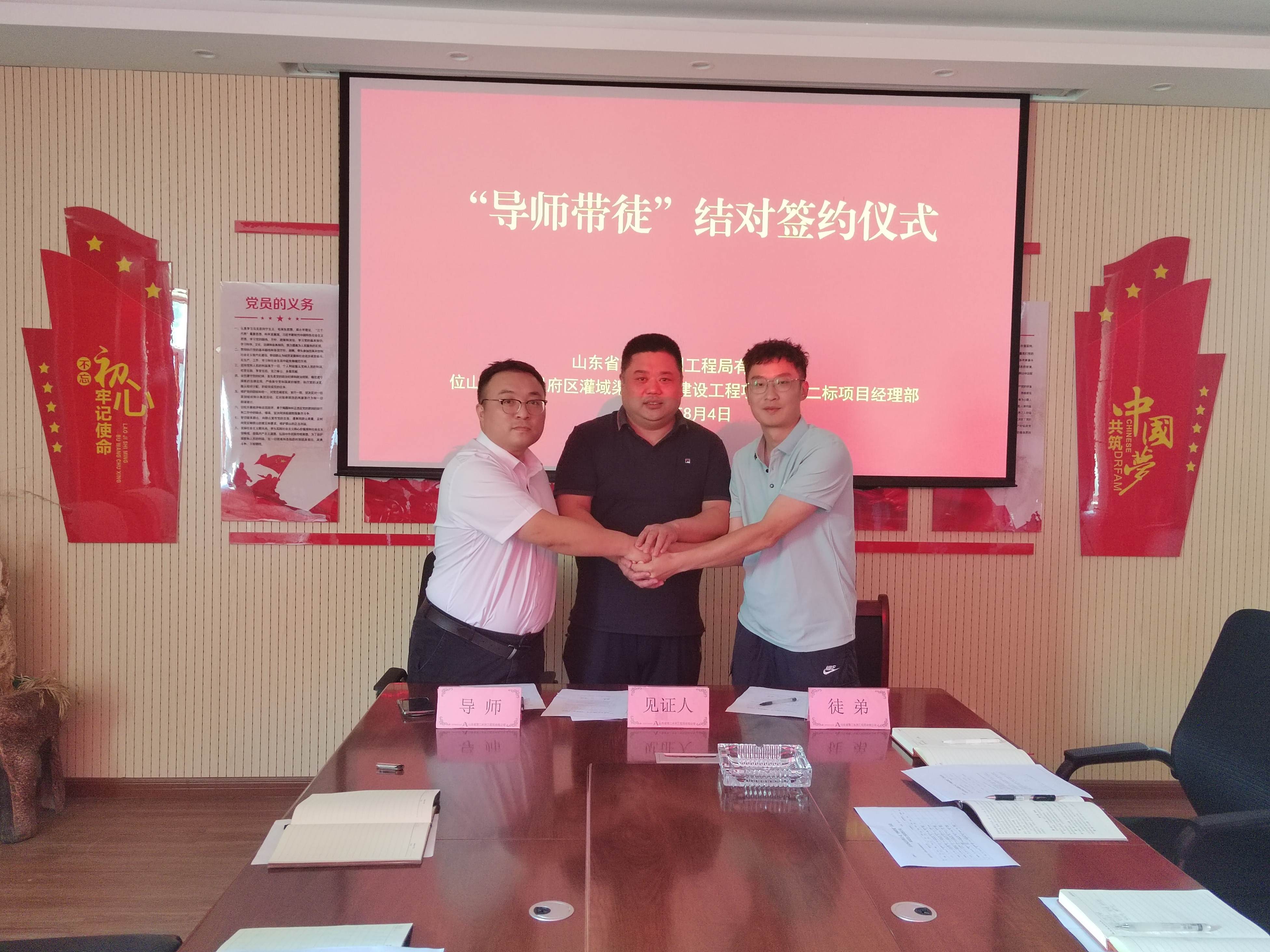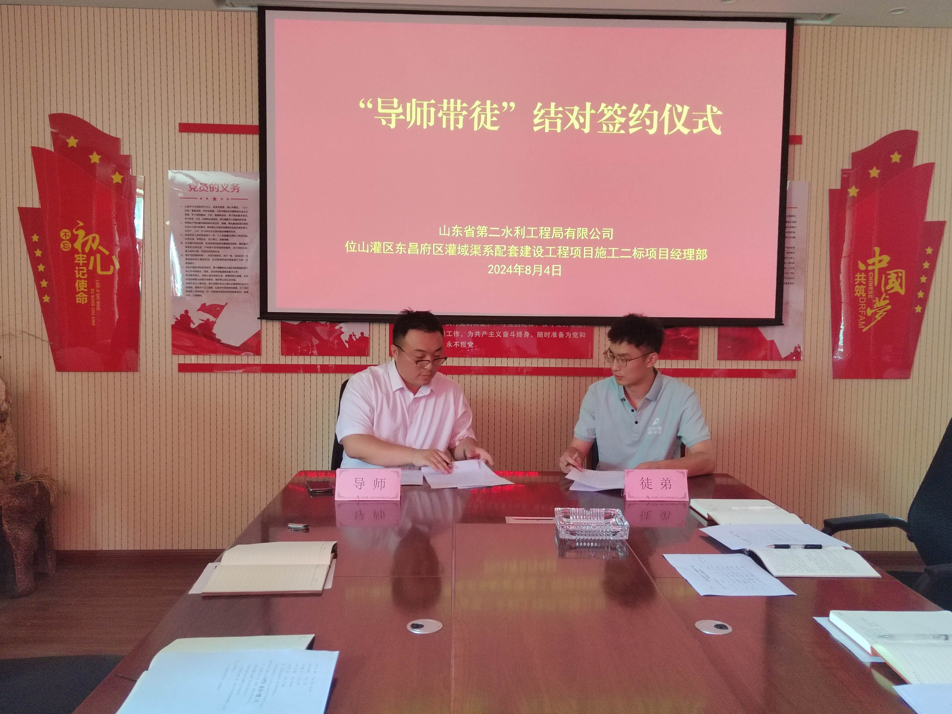 近日,二局有限公司位山灌区东昌府区灌域渠系配套建设工程项目施工2标项目经理部举行了“导师带徒”结对签约仪式。