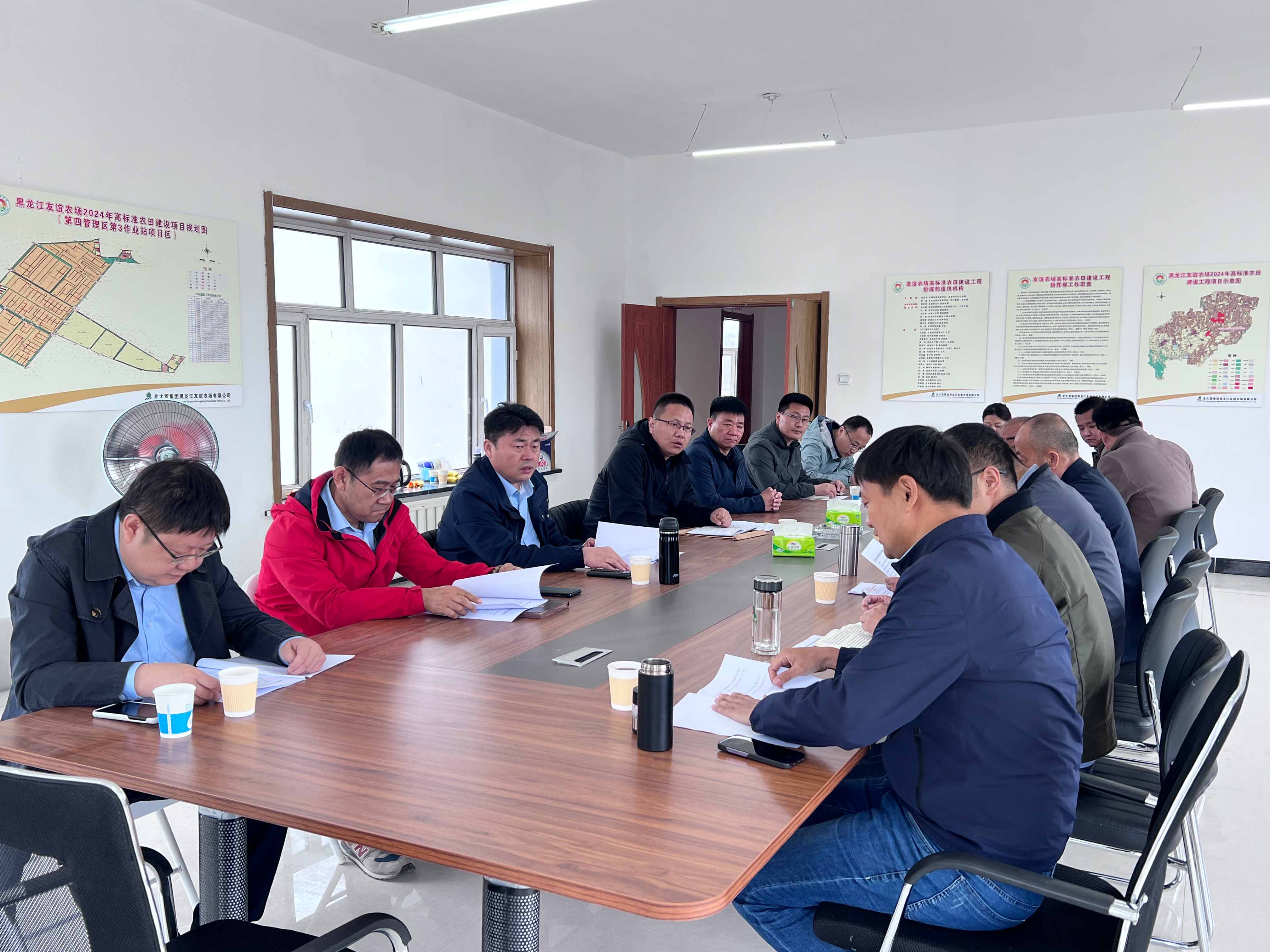 裴文晶一行首先来到黑龙江省粮食产能提升项目了解项目进展,并同项目部一线人员进行交流。随后,调研组来到黑龙江友谊农场2024年高标准农田建设项目,同北大荒集团黑龙江友谊农场有限公司副总经理樊庆华进行会谈。双方对当前项目的总体进度、面临的机遇和挑战进行了分析和研讨,并对下一步如何加强合作进行深入交流,展望两家省级国有企业合作的未来,努力发挥山东水总基础建设和北大荒集团农业生产运营的优势,打造出“1+1>2”的效果。